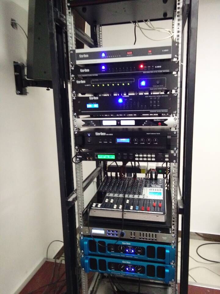 該項目中主擴揚聲器采用了兩只可調(diào)指向音箱壁掛的安裝方式,因此為了保證聲場均勻度達到廳堂擴聲系統(tǒng)聲學(xué)特性指標(biāo)中的國家規(guī)定,京邦電子技術(shù)人員在調(diào)試過程中對兩只音箱進行了仔細(xì)的調(diào)整,將音箱指向調(diào)整到可以最佳,使得聲音可以均勻的覆蓋,另外對六只后場吸頂音箱加以延時、音量等處理,避免了聲像不統(tǒng)一的問題。