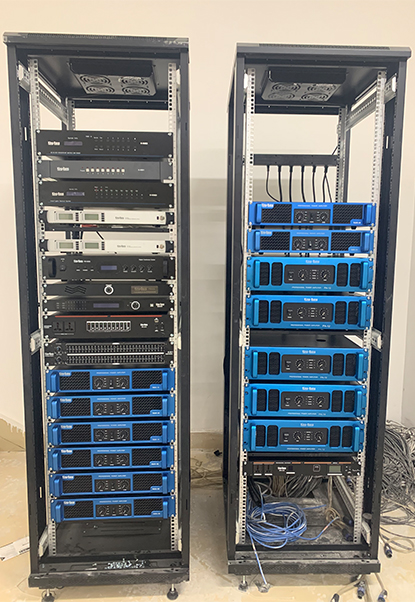 放大設(shè)備——指對(duì)經(jīng)過(guò)調(diào)控設(shè)備混音輸出、信號(hào)處理后的信號(hào)進(jìn)行后級(jí)功率放大設(shè)備,這里指專業(yè)功率放大器;重放設(shè)備——指將經(jīng)過(guò)后級(jí)功率放大器放大的音頻信號(hào)進(jìn)行電—聲轉(zhuǎn)換并釋放表現(xiàn)出來(lái)人耳可懂的聲頻信號(hào)的設(shè)備,這里指揚(yáng)聲器;